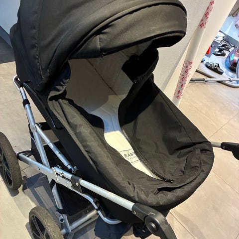 Barnevognen er godt brugt, men alt virker som det skal. Der følger regnslag, sele, solskygge, madras samt ekstrahjul og vedligeholdelses sæt med.