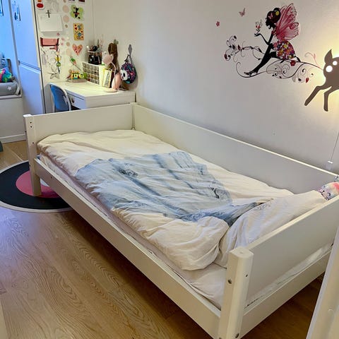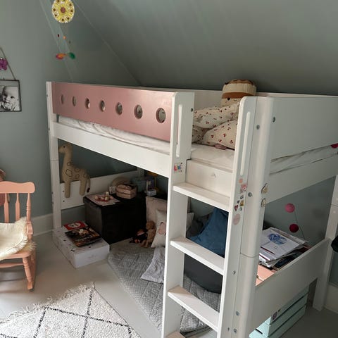 Flexa højseng 90*200 til børn. Sengen er designet til at skabe plads under soveområdet, hvilket kan udnyttes til opbevaring eller leg. Sengen er udført i træmateriale og har en enkel og funktionel konstruktion.