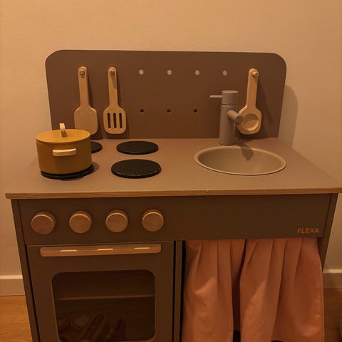 Flexa legekøkken i træ med grå farve. Køkkenet har fire kogeplader, ovn med glaslåge, vask med hane samt opbevaringsplads med stofpose og skab. Står virkelig flot og uden skrammer.