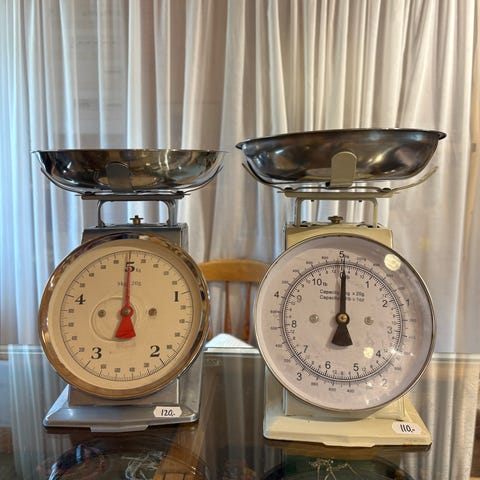 Gammel køkkenvægt. Kunne godt bruge en rengøring og lidt olie.