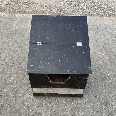 Kasse i træ med målene 100Lx50Bx36H cm. Med netlåg. Jeg byggede kassen til indendørs brug til kyllinger (før de kom ud i et udendørs hønsehus) og den fungerede godt til formålet. Jeg brugte den til 8 kyllinger.