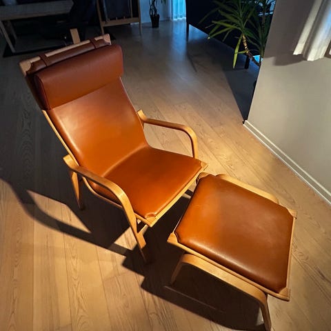 2 stk Ikea læder lænestole samt puf. Pæne og velholdte.