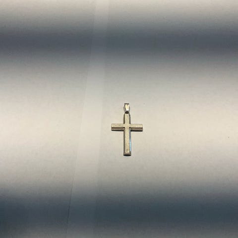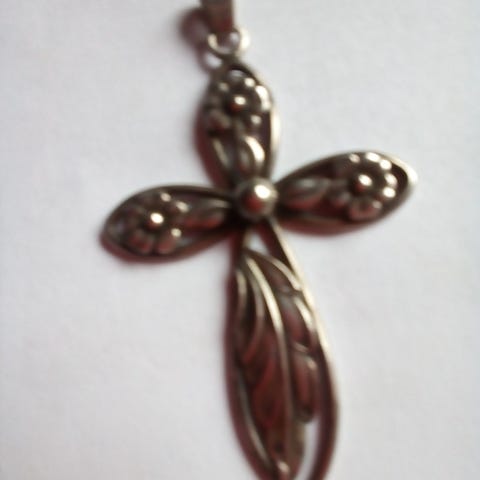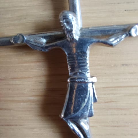 Dette kors har været min mormors. Hun var født i 1900, jeg mener, at hun fik dette i konfirmationsgave. Det er ikke massivt, der er ingen sølv mærker derpå, det måler 6x3,5 cm.