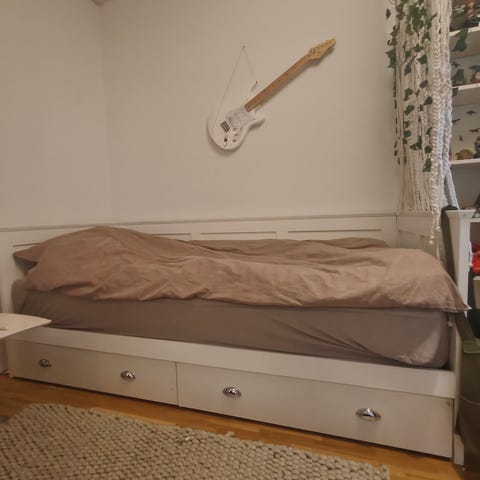 Hvid seng med brugstegn sælges