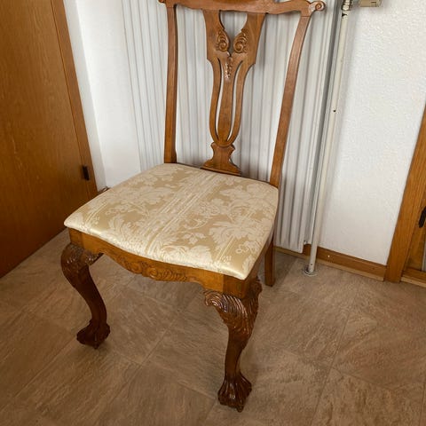 To antikke stole i træ med rød polstring på sædet. Stolene har udskårne rygstøtter med dekorative detaljer og drejede ben. Polstringen er i stof, og stolene er velegnede til brug som spise- eller dekorationsstole.