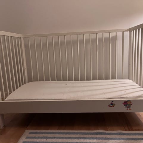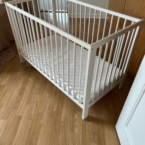 IKEA tremmeseng til børn. Sengen er hvid og lavet i træmateriale med tremmer på siderne. Den har en madras dreamzone med grå og beige stribet betræk. Sengen viser tegn på brug med enkelte skrammer og mærker på træet. Der mangler en side, og derfor kan madrassen kun sidde som på billede.