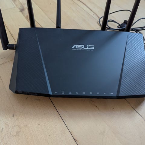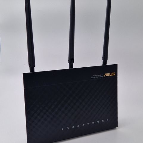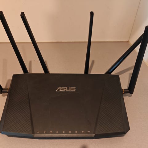 Sælger en ASUS RT-AC3200 Tri-Band Gigabit Router, perfekt til hjemmenetværk med mange enheder, streaming i høj opløsning og gaming uden lag.