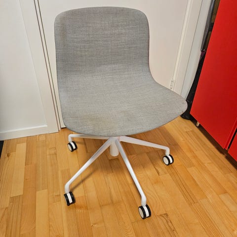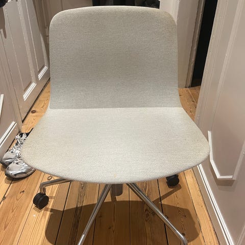 Stolen er blevet brugt som skrivebords stol. Der er nogle tegn på brug, nogle ridser i sædet og hak i armlænet (Se billeder). Ellers fremstår helt fint.