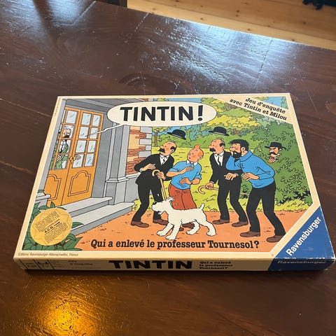 Tintin Mille Bornes Express kortspil med spillekort og instruktioner. Spillet indeholder forskellige kort til brug i spillet, herunder hastigheds-, angrebs- og forsvarskort. Kortspillet er baseret på det klassiske Mille Bornes spil med Tintin-tema. Aldrig brugt eller åbnet med plast om endnu.