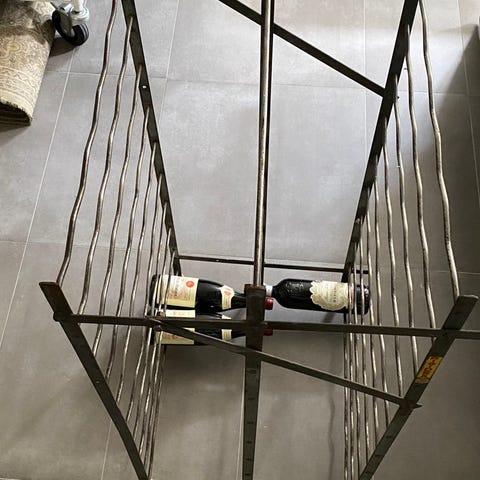 Gammel Fransk vinreol i træ med plads til 120 flasker. Designet til opbevaring af Champagne/vinflasker i stående position. Velegnet til brug i hjemmet til organisering og opbevaring af Champagne og vin.