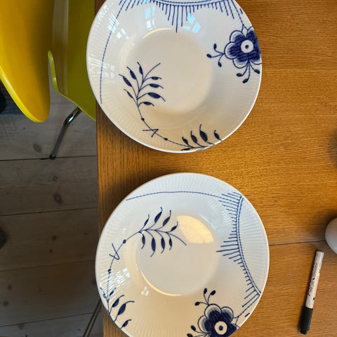 2 stk Royal Copenhagen Musselmalet Riflet tallerken i porcelæn med klassisk blå og hvid musselmalet dekoration.