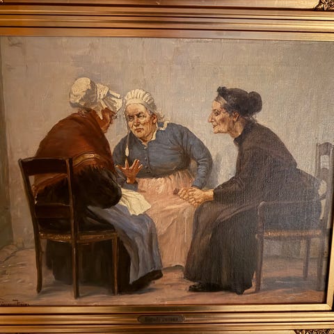 maleri med motiv af tre mænd siddende ved et bord. Maleriet har en ramme og viser detaljerede figurer i en indendørs scene.