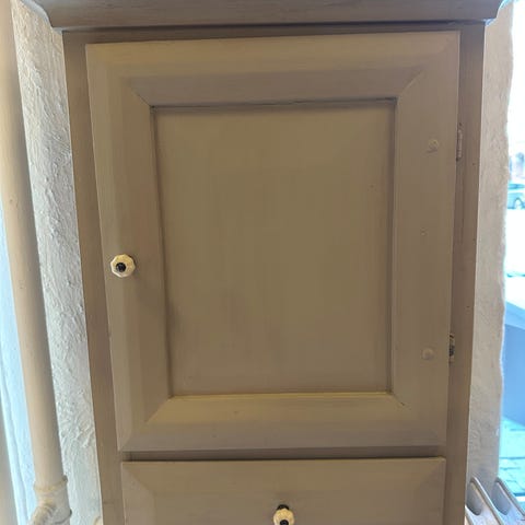 Fine, ældre vægskabe i hvidmalet træ. Kvadratisk skab: 40 x 40 x 13. 150kr Dobbeltskab: 60 x 40 x 13. 200kr. Begge for 300 kr.