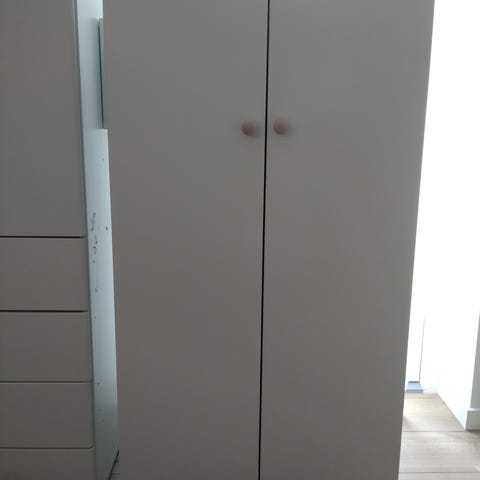 Knopper er malet i lyserød. En af skabslågernes knopper er lidt løs. På venstre side af skabet, set fra forsiden, er der skruehuller, som kan ses på billederne.
