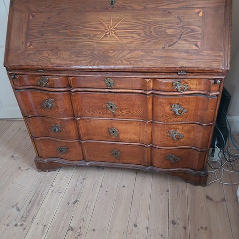 Snedkergårdens stilmøbler skrivebord fremstillet i egetræ. Skrivebordet har en klapfunktion med indvendige rum og skuffer til opbevaring. Designet med buede fronter og dekorative beslag. Velegnet til opbevaring og skrivearbejde.
