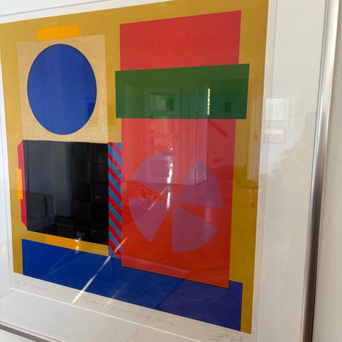 Festival serigrafi kunsttryk nummereret 1/5, signeret og dateret med romertal. Farverne inkluderer blå, grøn, rød, sort og orange, og motivet består af geometriske former og mønstre. Trykket er egnet til indramning og vægophæng som dekorativ kunst.