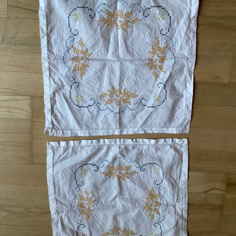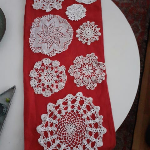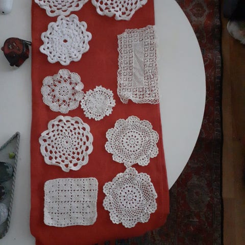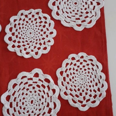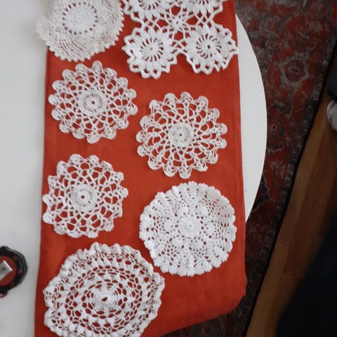 Smukke råhvide med små nister af pastelfarver. Hjemme hæklede. Jeg har 15 stk.