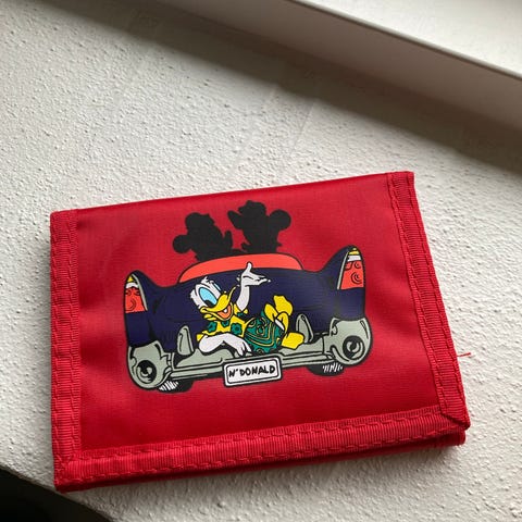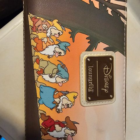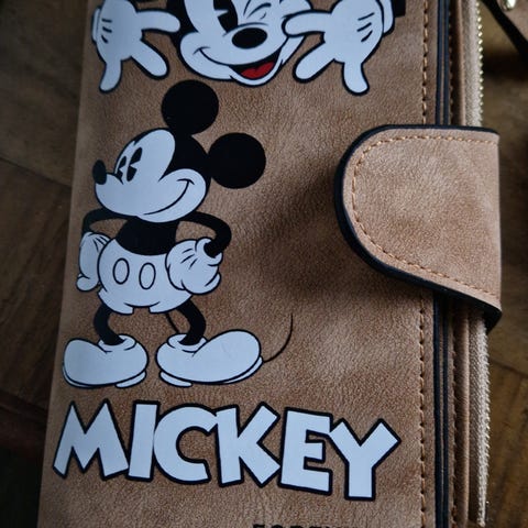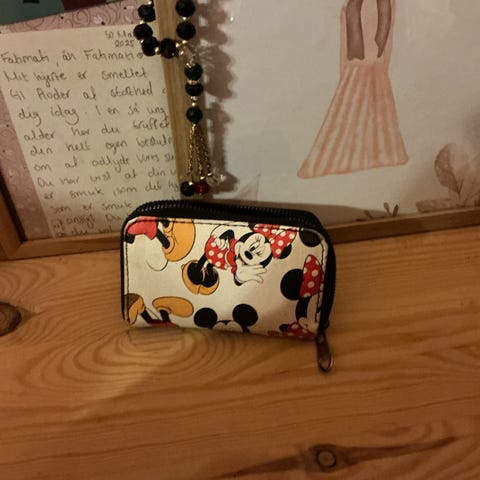 Disney stof pung designet til kvinder, lavet af stofmateriale. Pungen har flere rum til opbevaring af kort og mønter, inklusive et gennemsigtigt rum til ID-kort. Den har en lynlåslukning og en klap med trykknap på forsiden.