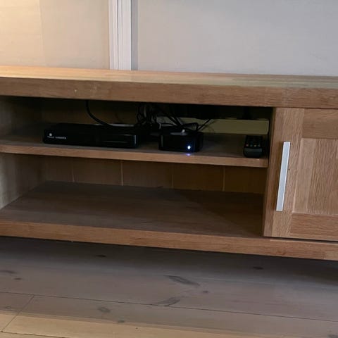 IKEA TV-bord i træ med tre skuffer og tre åbne hylder til opbevaring. Møblet har en naturlig træfarve og et enkelt design, der passer til forskellige indretninger. Velegnet til opstilling af TV og opbevaring af tilbehør. GIV ET BUD