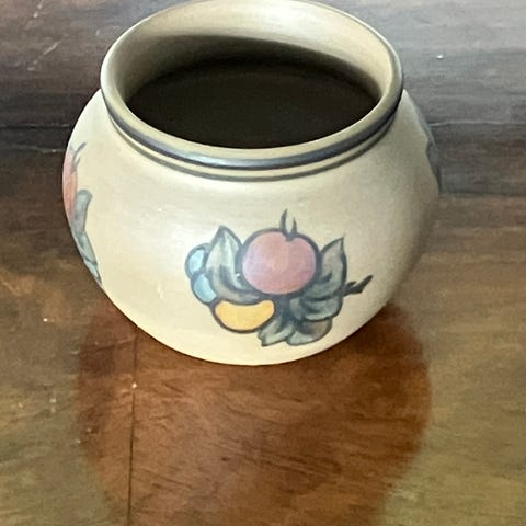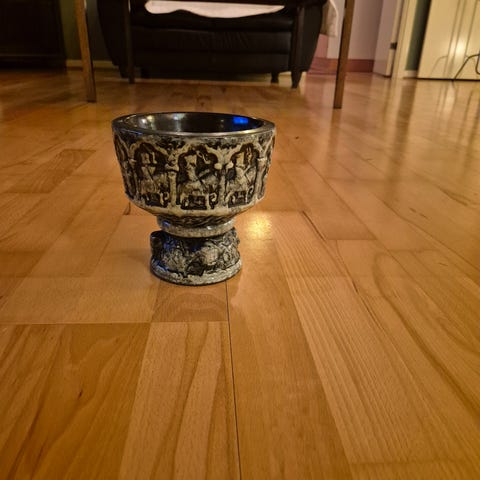 L. Hjorth keramik skål med detaljerede relieffer hele vejen rundt. Skålen er udført i mørkt keramikmateriale og har en rund form med en bred fod. Motiverne på skålen viser forskellige figurer og scener i relief. Skålen kan anvendes som dekorativ genstand eller til opbevaring. 13 cm høj 12 cm i diameter.