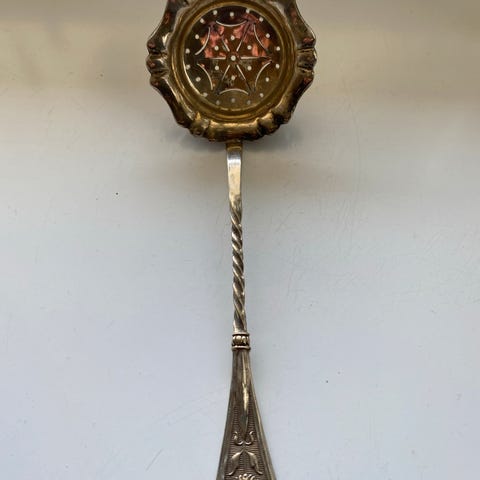 Strøske i sølvplet med en dekorativ skål med udskåret mønster. Skeens håndtag har et elegant design med prægede detaljer. Skeens materiale er sølvplet og den har en længde på ca 15 cm.