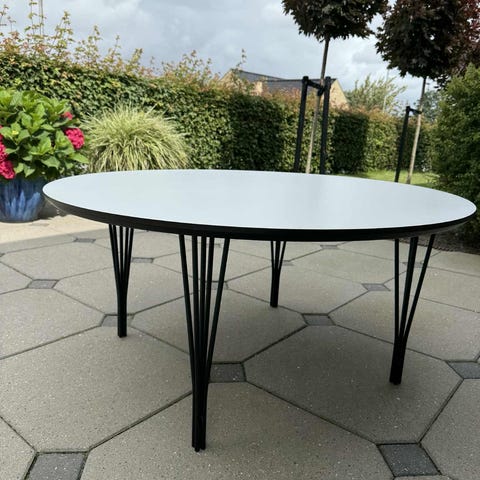 Begge borde er med hvid overflade med sorte træben. En lille skade på siden.