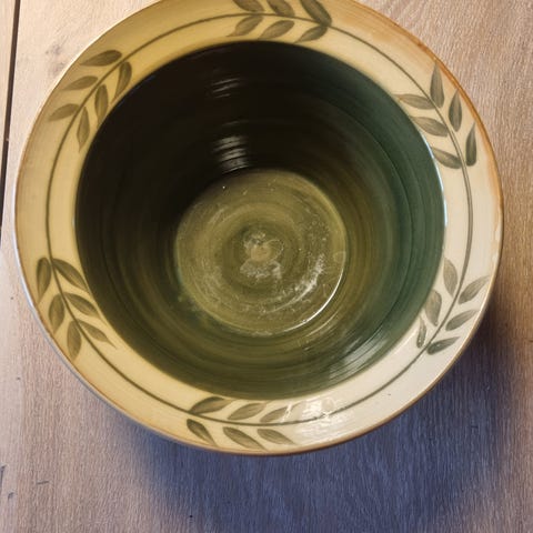 Stor, smuk keramikkande af den canadiske keramiker Julia Manitius, der boede og arbejdede ca. 30 år i Danmark bl.a. på Bornholm. Hun vekslede mellem det traditionelle og det mere moderne prægede keramik og skabte gennem tiden nogle fantastisk smukke (ofte brugsgenstande) men også mere kunstneriske arbejder, hvor formsproget i begge dele var inspireret af naturens former og farvespil og med en rigtig lækker kvalitet i både håndværk og funktionalitet. Hun har desuden arbejdet med tekstil. Hendes signerede værker er forholdsvis sjældne.