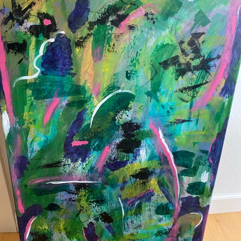 Abstrakt maleri med brug af blandede farver som pink, gul, blå og lilla. Maleriet har en horisontal opbygning med tydelige penselstrøg.