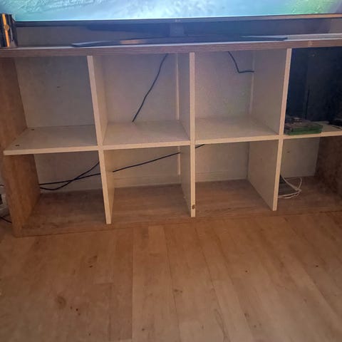 Sort reol med åbne rum, skuffer og skabe, fin til ungdomsværelset.