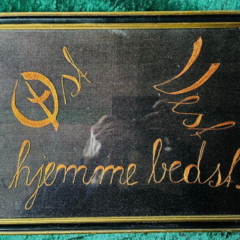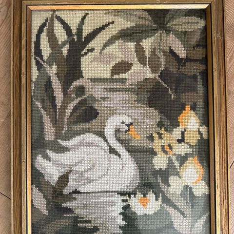 Svigermors broderet billede ( 70 x 40 x 3 cm ), superhyggeligt mor,børn & hund i den lune almue stue ; kært ældre broderet billede kan ses & hentes i Esbjerg Midtby, kan sendes..