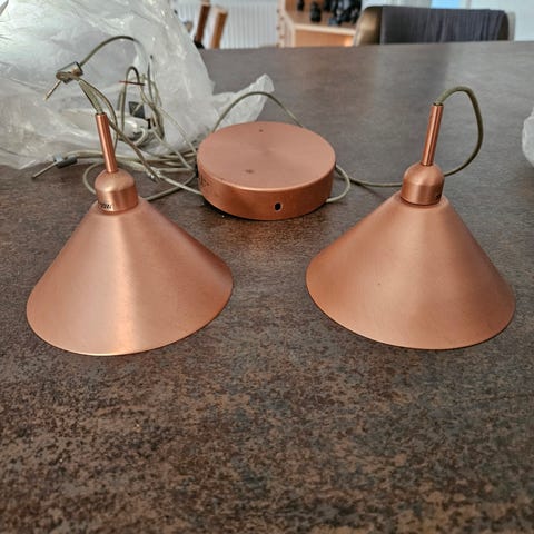Kort monteret, da vi flyttede ind, men passede ikke til husets stil. Siden har den stået i den originale pakke. Perfekt stand inkl. lyskilde.