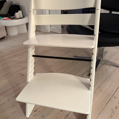 Stokke Tripp Trapp højstol i hvid farve. Højstolen er designet til børn og kan justeres i højde og dybde for at tilpasse sig barnets vækst. Fremstillet i træmateriale, der sikrer stabilitet og holdbarhed.