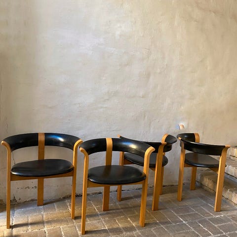 Stolene har ærlige brugsspor, der passer til alderen og understreger deres autentiske udtryk. Den originale polstring er i god stand. Ompolstring kan arrangeres efter ønske.