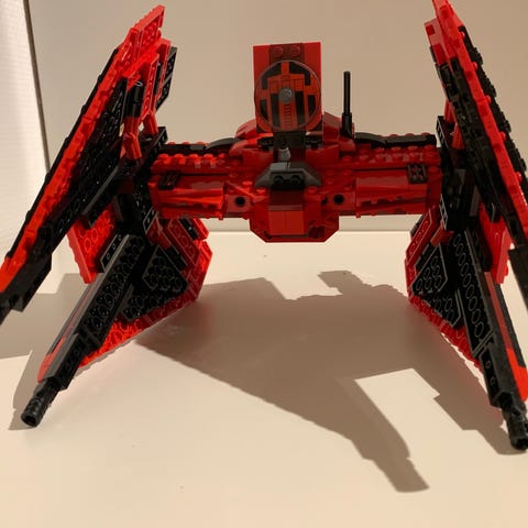 LEGO Star Wars TIE Fighter minifigur og rumskib i sort og rød farve. Modellen inkluderer en minifigur og er en del af LEGO Star Wars temaet. Samlehæfte medfølger.