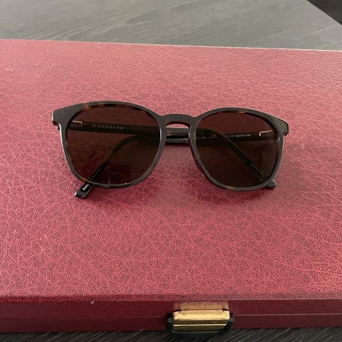 D. Arnesen solbriller til kvinde med stel i klar plast og mørke glas. Brillerne leveres med etui og pudseklud med D. Arnesen logo.