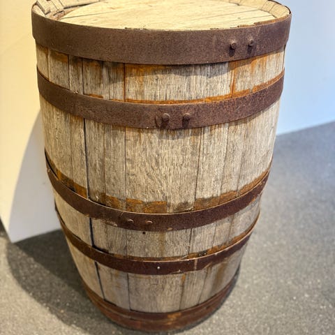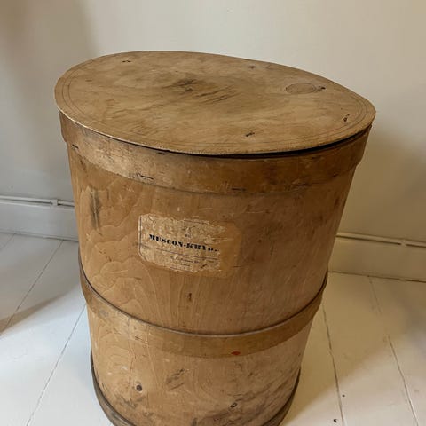 Vintage dekorativ trætønde med broderet låg – 55 cm høj