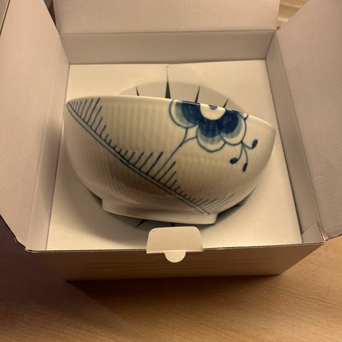 Royal Copenhagen Blue Fluted Mega skål med håndmalet blå blomsterdekor på hvid porcelæn. Skålen er designet i Danmark og fremstillet i Thailand. Den har modelnummer 457 og er en del af Blue Fluted Mega serien.