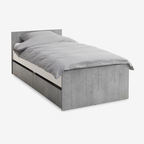 Jysk seng med madras. Sengen har ben i sort metal og er betrukket med gråt stof. Madrassen er hvid med tydelige brugsspor og pletter. Sengen er enkel og egnet til enkeltpersoner.