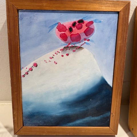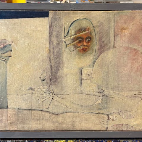 Olie på lærred, signeret foran og bagpå. Fra den kendte rosengartner Torben Thim, der også havde en billedkunst karriere i 70-80'erne. Billedet er I rigtig fin stand, med smuk lys træramme, der klæder billedet godt. Måler 60 x 73 cm uden ramme. Kan afhentes centralt i København P-plads til standsning lige ud for døren.