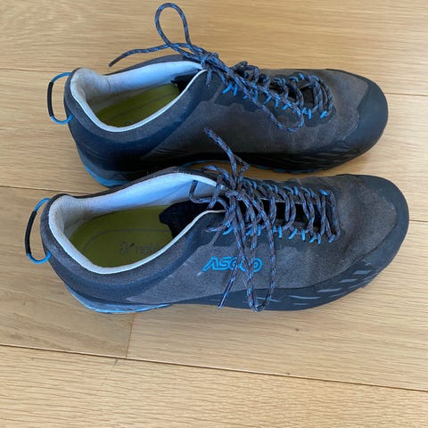 vandresko i størrelse 37, designet til vandring. Skoene er grå med gule og lilla detaljer, og de har en slidstærk sål fra vibram. Materialet er egnet til udendørs brug og giver støtte og komfort under vandreture.