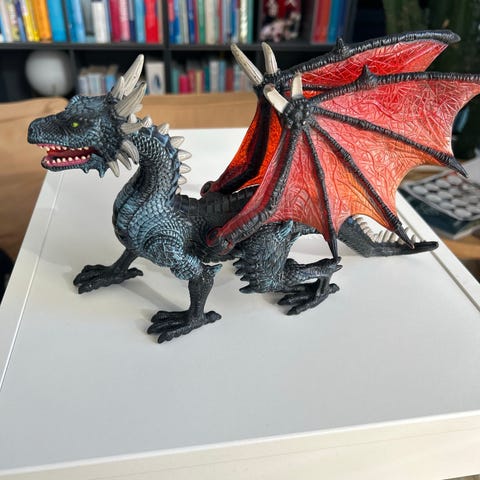 Skrigende død drage figur i beige/hvid farve med røde detaljer. Figuren har vingespænd og er designet med mulighed for at åbne munden og synlige tænder. Fra ‘Sådan træner du din drage’. Bogen følger ikke med.
