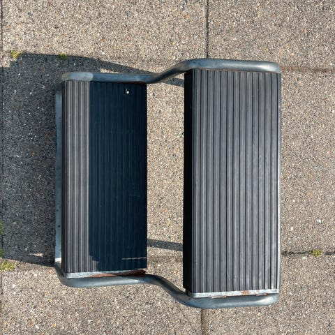Trappetrin i træ med gråt tæppe på trin og sider. Trappetrinene har indbygget opbevaringsrum under trin, der kan åbnes. Designet til at hjælpe med adgang til højere områder eller som hjælp til kæledyr.