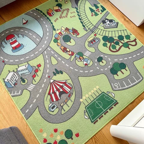 Sødt legetæppe/gulvtæppe til børneværelset med blød overflade og skridsikker underside (med gummi), måler ca. 133 cm x 141 cm.