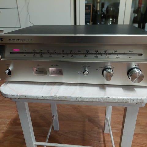 JVC Receiver stereo med sølvfarvet frontpanel. Enheden har analoge drejeknapper og en række indgange til tilslutning af lydkilder. Velegnet til afspilning af musik/radio i stereoanlæg.