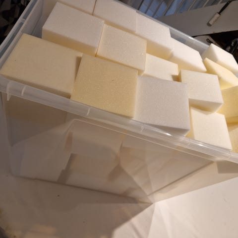 En stor skumblok på cirka 50 x 50cm og tykkelse 10cm.