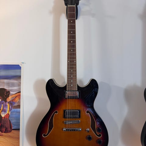 Epiphone halvakustisk guitar i sunburst farve. Guitaren har en krop med hulrum og er velegnet til forskellige musikgenrer, hvor en kombination af akustisk og elektrisk lyd ønskes.