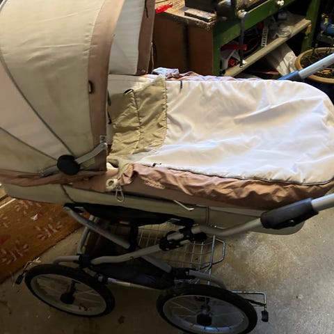 BRIO barnevogn i brun farve med stel i metal. Barnevognen har en rummelig lift med polstret indvendig betræk og justerbart kaleche. Den er designet til at give komfort og beskyttelse til barnet under gåture. Vognen har store hjul, der sikrer stabilitet og nem manøvrering på forskellige underlag.
