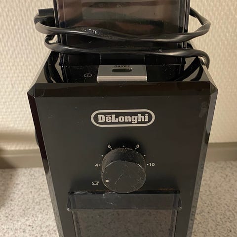 De'Longhi kaffekværn i sort farve. Med justerbar formalingsgrad og timer. Virker upåklageligt.