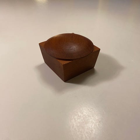 Smykkeskrin, æske i teaktræ. Måler 8,5 x 8,5 cm bredeste sted. Højde med låg ca. 6 cm. Låg 9,5 cm i diameteren.