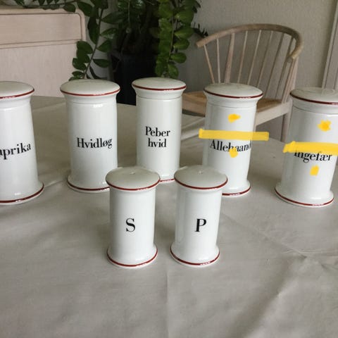 Bing & Grøndahl Apoteker krydderikrukker. Har nummer 497. Glasene er hvide med tekst på. Materiale er porcelæn. Sættet er velegnet til opbevaring af krydderier i køkkenet.